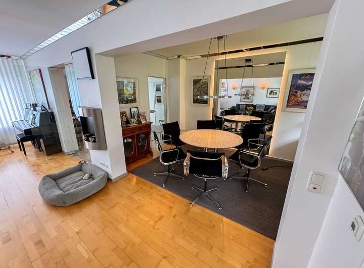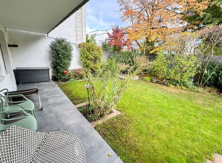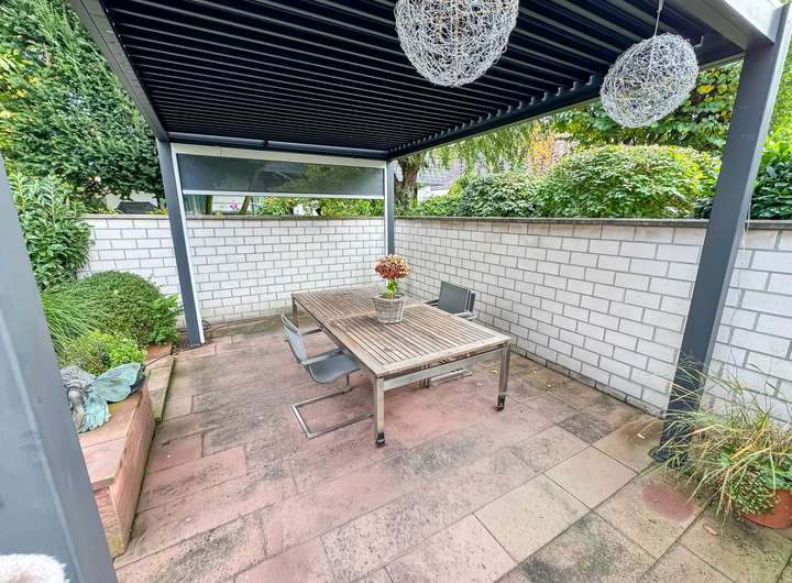 Im Erdgeschoss erwartet Sie ein lichtdurchfluteter Wohn- Essbereich mit direktem Zugang zur sonnigen Terrasse und dem gepflegten Garten. Hier finden Sie einen kleinen Teich, eine überdachte Sitzecke sowie ausreichend Platz zum Entspannen.