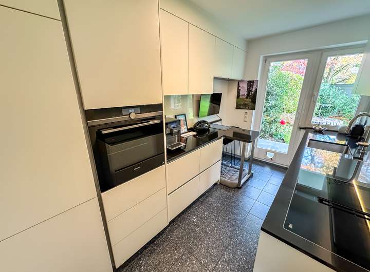 Die moderne Einbauküche ist mit hochwertigen Elektrogeräten ausgestattet und bietet viel Komfort im Alltag. Ein Gäste-WC sowie ein separater Abstellraum oder eine Garderobe runden das Raumangebot im Erdgeschoss ab.