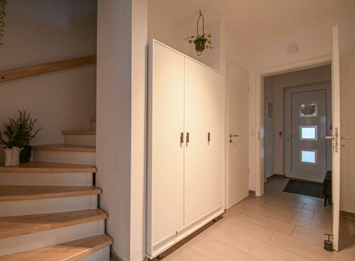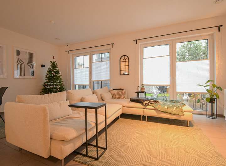 Auch technisch weiß diese Immobilie zu überzeugen: Kunststofffenster mit 3-fach-Verglasung und Schallschutz, weiße Türen, eine moderne Einbauküche und durchgehende Fußbodenheizung schaffen zeitgemäßen Wohnkomfort. Die aktive Wohnraumbelüftung mit Wärmerückgewinnung, kombiniert mit der hochwertigen Dämmung, sorgt für ein erstklassiges Raumklima und senkt den Energiebedarf deutlich.