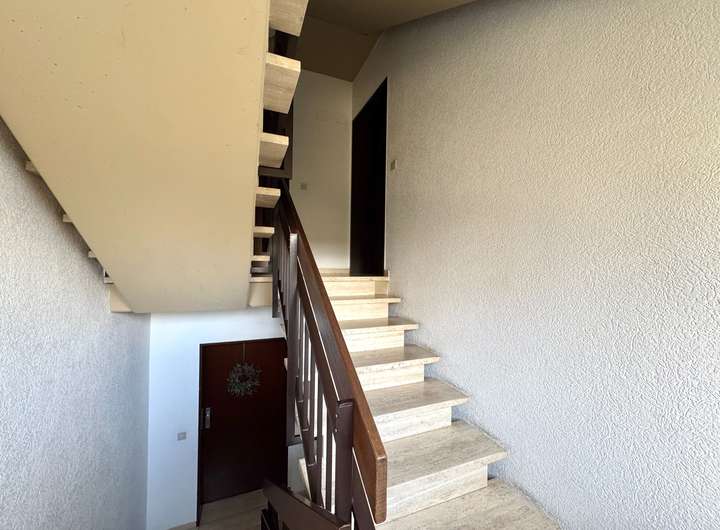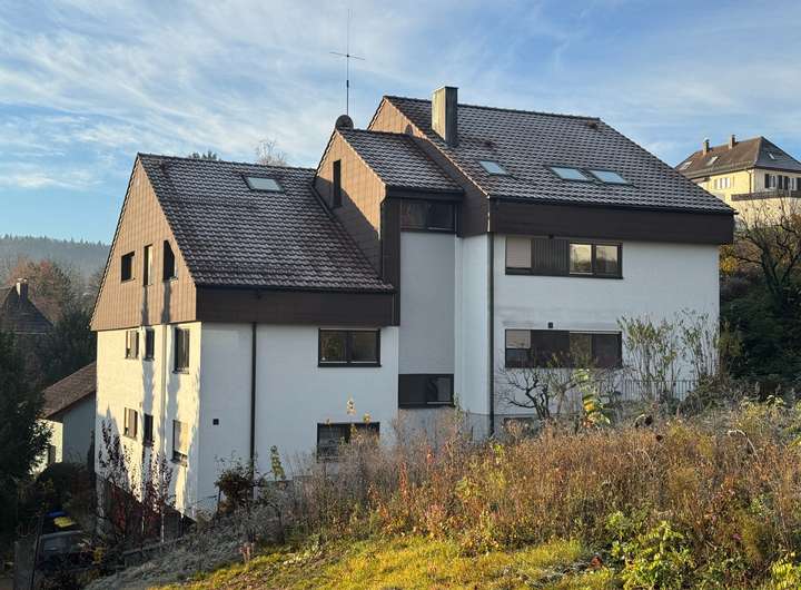 Die Wohnung liegt in einem gepflegten Mehrfamilienhaus aus dem Jahr 1982 und befindet sich im 1. Obergeschoss. Durch die Hanglage wirkt sie teilweise wie eine Erdgeschosswohnung. Zum Eingang und zur Wohnung führen einige Stufen.