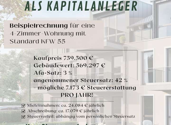 - Personenaufzug - Tiefgaragenstellplätze - Fassadenbegrünung & gelebter Artenschutz mit bienenfreundlichen Pflanzen, Bäume und Sträucher - helle, offene Grundrisse mit großzügigen Fensterfronten für optimale Lichtverhältnisse - energieeffiziente Bauweise nach dem Effizienzhaus-Standard 55 - Luft/Wasser-Wärmepumpe - Erstbestellung einer Hausverwaltung - Spielplatz - Photovoltaik-Anlage - eigener Kellerraum - Waschraum im Keller oder wahlweise in Ihrer Wohnung - Glasfaseranschluss