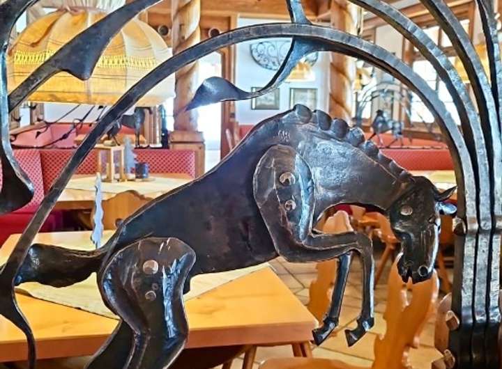 Ein besonderes Highlight bildet der teilweise einsehbare Blick aus dem Gastraum in die kleinere Reithalle – ein faszinierendes Detail für Besucher und Pferdefreunde.