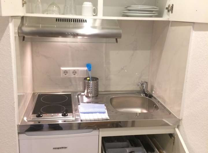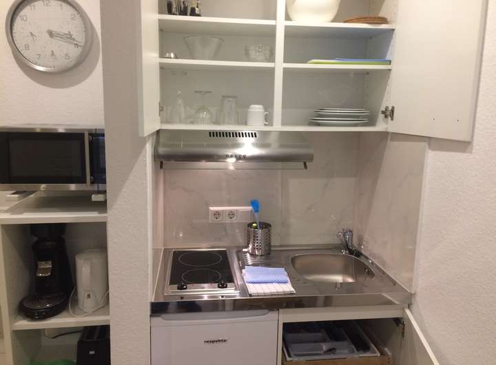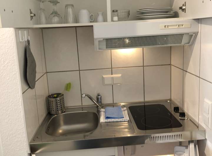 High Speed Internet (W-Lan) und Kabelfernsehen sind stehen kostenlos zur Verfügung, die Wohnung hat ein großes Bad mit Dusche, WC und Spiegelschrank, Vollausgestattete Kitchenette mit zwei Kochplatten, Kühlschrank, Mikrowelle, Fön, Wasserkocher, Kaffeemaschine, Teller, Töpfe sowie Pfannen, Besteck, Toaster, ein Spiegelkleiderschrank, ein Doppelbett, Waschmaschine und