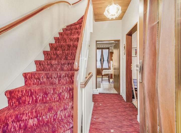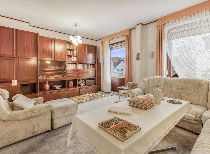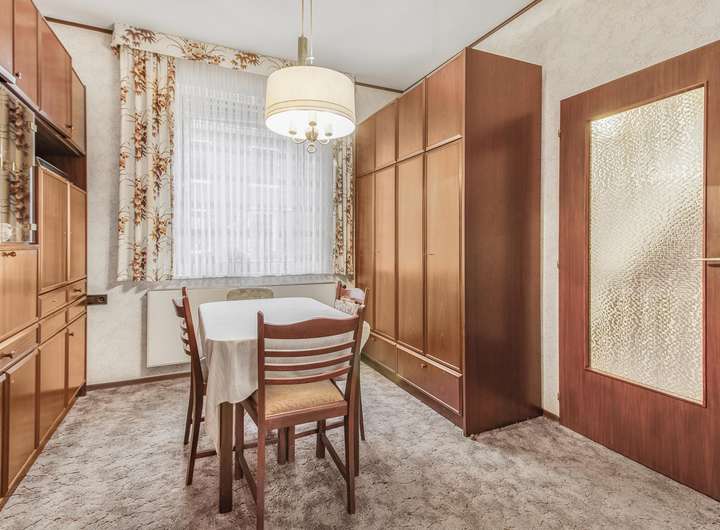 Bereits im Erdgeschoss überzeugt das Haus mit einem großzügigen Wohnbereich, der über den Flur erreichbar ist und viel Raum für gemütliche Abende und persönliche Einrichtungsideen lässt. Die angrenzende Küche ist mit einer älteren Einbauküche ausgestattet und bietet zusätzlich Platz für einen kleinen Esstisch – ideal für einen entspannten Start in den Tag. Von hier aus gelangen Sie direkt auf die Terrasse, von der eine Treppe in den Garten führt.