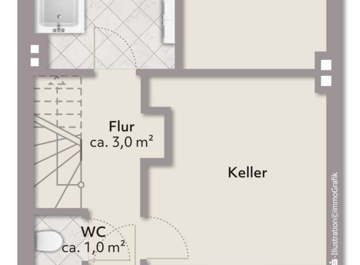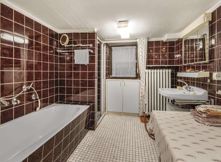 Der Vollkeller bietet zusätzlichen Komfort: Hier finden Sie das Badezimmer, ein separates WC, sowie zwei große Kellerräume, die wertvollen Stauraum schaffen oder sich für Hobbyzwecke nutzen lassen.