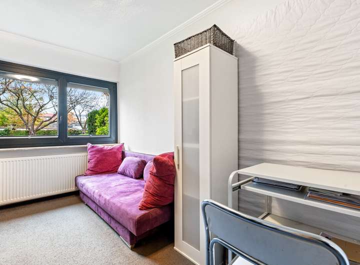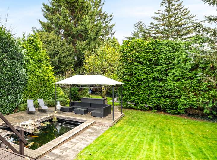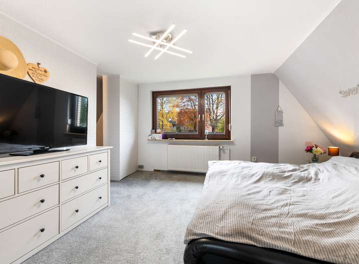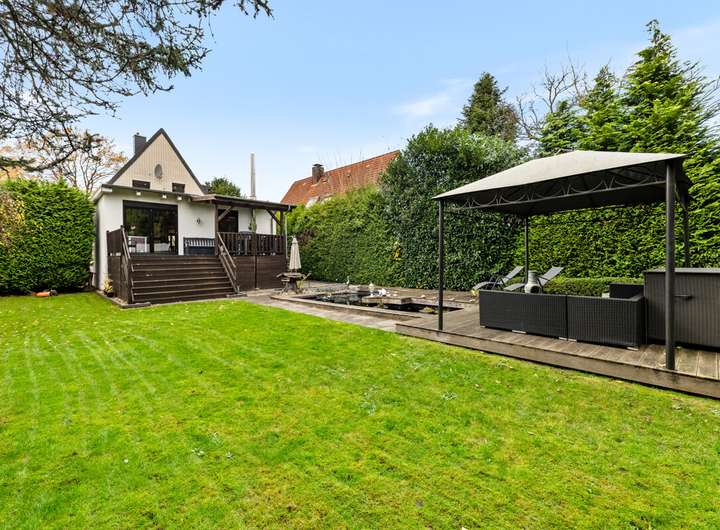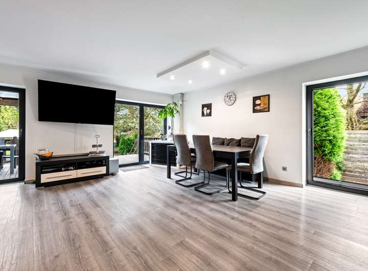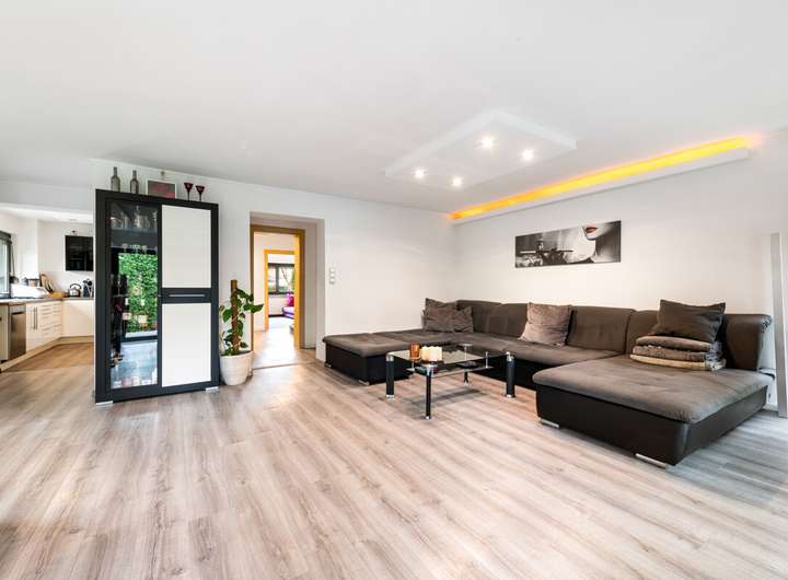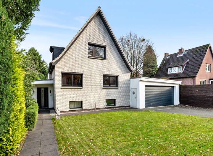 Dieses moderne Einfamilienhaus wurde im Jahr 2015 umfangreich saniert und durch einen großzügigen Anbau erweitert. Es befindet sich auf einem pflegeleicht angelegten ca. 1.000,00 m² großen Grundstück mit beheizbarem Schwimmteich. Sie betreten das Haus durch einen hellen Eingangsbereich. Von dort führen wenige Stufen ins Hochparterre. Von hieraus gelangen Sie in den großzügigen Wohnbereich mit Kamin und offener Küche. Die moderne Küche verfügt über einen praktischen Abstellraum und öffnet sich zum ca. 40,00 m² großen Wohnzimmer. Das lichtdurchflutete Wohnzimmer mit bodentiefen Terrassenfenstern befindet sich im Anbau von 2015. Die Statik des Anbaus ermöglicht zudem eine Aufstockung, wodurch in der zweiten Etage weitere ca. 40 m² Wohnfläche geschaffen werden könnten. Vom Wohnbereich gelangen Sie direkt auf die überdachte Holzterrasse mit Blick in den eingewachsenen Garten. Der beheizbare Schwimmteich und die Südwestterrasse sind die Highlights im Garten. Zur Straßenseite hin liegen zwei weitere Zimmer mit ca. 10,00 m² und 15,00 m². Diese waren ursprünglich miteinander verbunden und lassen sich bei Bedarf wieder zusammenführen. Darüber hinaus runden ein modernes Badezimmer mit Dusche sowie ein separates Gäste-WC das Erdgeschoss ab. Im zweiten Obergeschoss befinden sich ein Schlafzimmer mit abgetrennter Ankleidenische sowie ein modernes Badezimmer mit bodentiefer Dusche, Badewanne und Tageslichtfenster. Zusätzlich gehört ein weiteres Gäste-WC zur Etage. Die ans Haus angrenzende Doppelgarage bietet über 40,00 m² Nutzfläche.