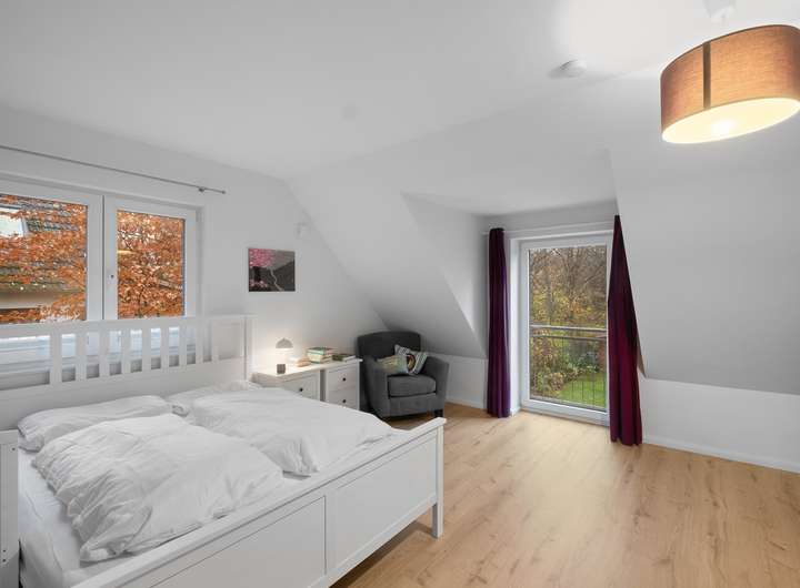 Das Obergeschoss beherbergt zwei großzügige Schlafzimmer, die durch ihre Größe und Helligkeit vielfältige Nutzungsmöglichkeiten bieten. Ein Tageslichtbad mit moderner Ausstattung sowie ein zusätzlicher Abstellraum runden das Raumangebot dieser Etage ab.