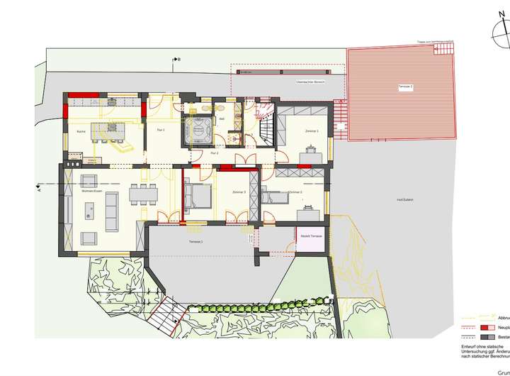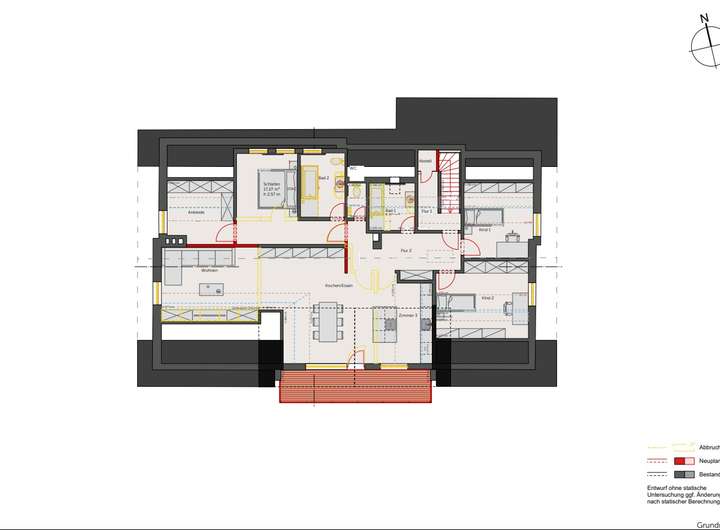 Die Immobilie wurde im ursprünglichen Bauantrag als Einfamilienhaus mit Erdgeschoss und Kellergeschoss genehmigt. In den 80er-Jahren wurde das Gebäude, ohne dokumentierte Genehmigung, im Obergeschoss erweitert. Auch der Keller wurde um Räumlichkeiten erweitert. Hierzu wurde von den Eigentümern bereits eine Baugenehmigung eingereicht und genehmigt, da die Genehmigung wie ein Neubau bewertet wird, müssen bei einer Sanierung die neusten energetischen Standards beachtet werden.