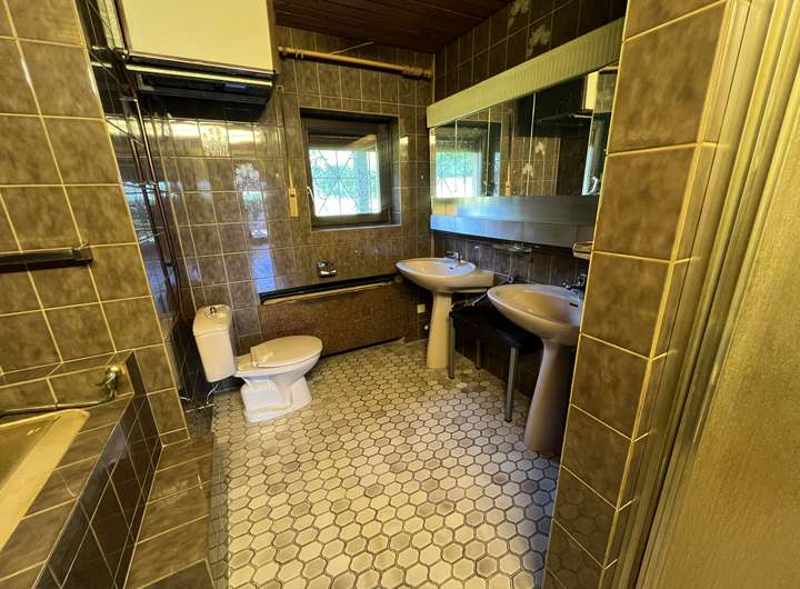 Das Badezimmer im Erdgeschoss ist mit einem Whirlpool, einer Dusche, einem Doppelwaschbecken sowie einem WC ausgestattet.