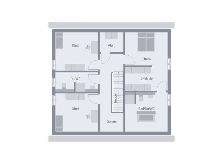 Das Einfamilienhaus Design 16 besticht auf zwei Etagen durch sein großes Platzangebot, die clevere Raumaufteilung und exklusive Ausstattungsdetails. Vom Eingang im Erdgeschoss führt ein langer Flur geradeaus in den gegenüber liegenden Essbereich, der zu beiden Seiten offen ist und in den großen Wohnbereich und in die Küche übergeht. So findet das Tageslicht, das durch die zahlreichen Fenster und Glastüren dringt, seinen Weg bis in den letzten Winkel. Ergänzt wird das Raumangebot im Erdgeschoss durch den von der Küche aus zugänglichen Hauswirtschaftsraum, das Gäste-WC mit Dusche direkt am Eingang sowie das lichtdurchflutete Arbeitszimmer, das selbstverständlich auch als Gästezimmer genutzt werden kann. Im Obergeschoss gelangen Sie von der zentral gelegenen, geräumigen Galerie in den großzügig bemessenen Elternbereich mit Schlafzimmer, direkt angrenzendem begehbarem Kleiderschrank und einem Badezimmer.