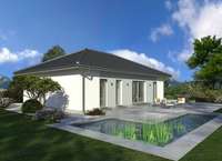 Unser Bungalow 1 Walmdach bietet auf einer Wohnfläche von 107 m² alles, was die Kleinfamilie zum Wohnen und Wohlfühlen benötigt. Das kombinierte Wohn-Ess-Zimmer ist großzügig geschnitten und dank drei Glastüren zum Garten hin schön hell. Auch die vom Esszimmer türlos zugängliche Küche bietet genügend Platz und Tageslicht. Der angrenzende, 10 m² große Hauswirtschaftsraum ist auch direkt von außen betretbar und hat dadurch gleich in doppelter Hinsicht einen praktischen Nutzen: Einkäufe können auf diese Weise direkt versorgt werden und die Wohnräume bleiben von möglichen Schmutzschuhen verschont. Der ebenfalls geräumige Flur verbindet den Wohnbereich des Hauses mit den privaten Rückzugsorten: dem Bereich der Eltern mit Schlafzimmer und angeschlossener Ankleide und einem lichtdurchfluteten Kinderzimmer. Ein voll ausgestattetes Bad mit Badewanne und Dusche sowie ein Gäste-WC runden das Angebot ab.