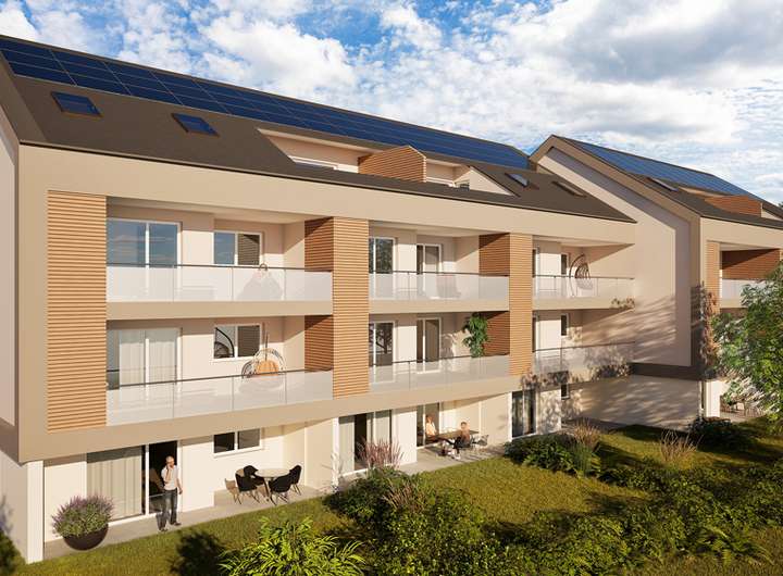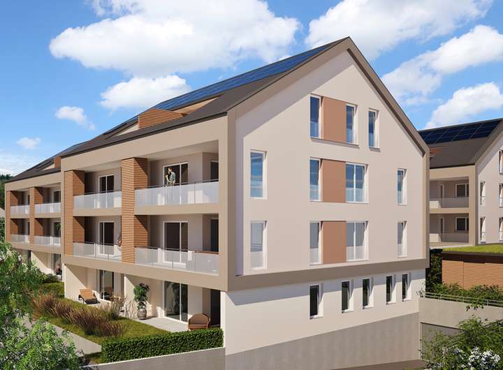 Zahlreiche bodentiefe Fenster sorgen für ein sonniges und luftiges Raumgefühl und auch die Treppenhäuser wirken dank der Glasfassade hell und einladend. Alle Wohnungen punkten zudem mit großzügigen Freisitzen in Form von Terrassen, Balkonen und Dachterrassen. Bewohner der Erdgeschosswohnungen dürfen sich auf Wunsch über einen eigenen Gartenanteil als Sondernutzungsrecht freuen.