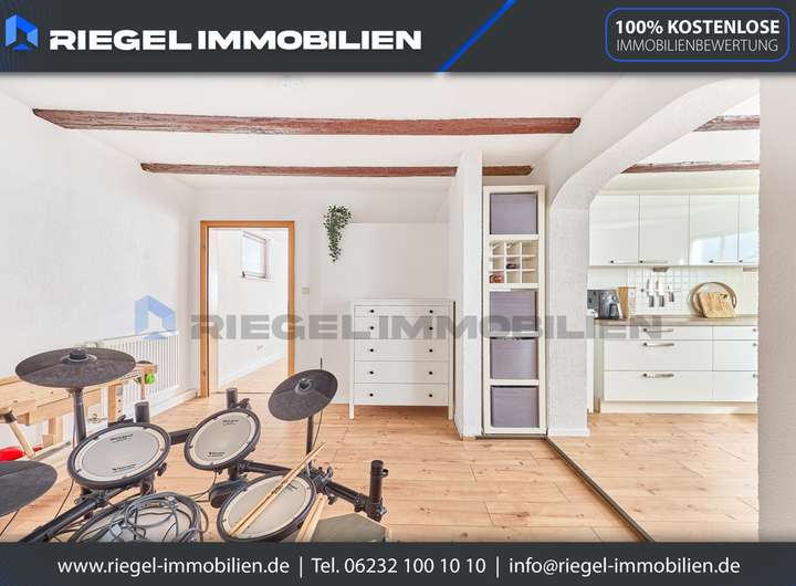 Im Erdgeschoss sind teilweise Holzbalkendecken verbaut, die dem Raum ein traditionelles und charaktervolles Flair verleihen.