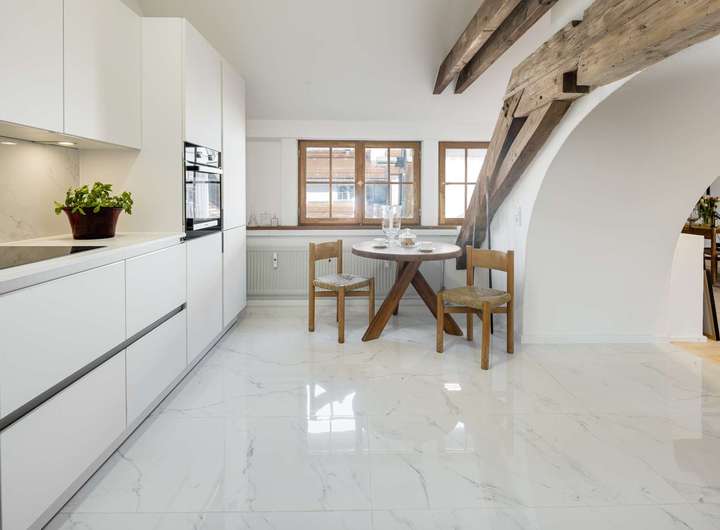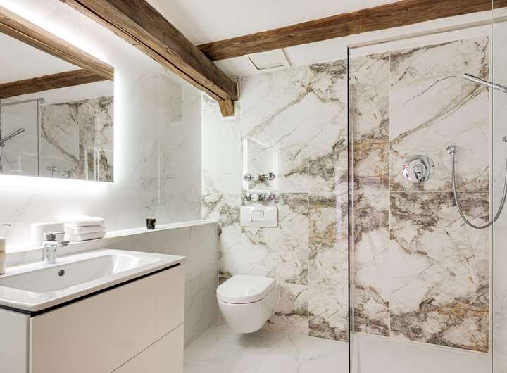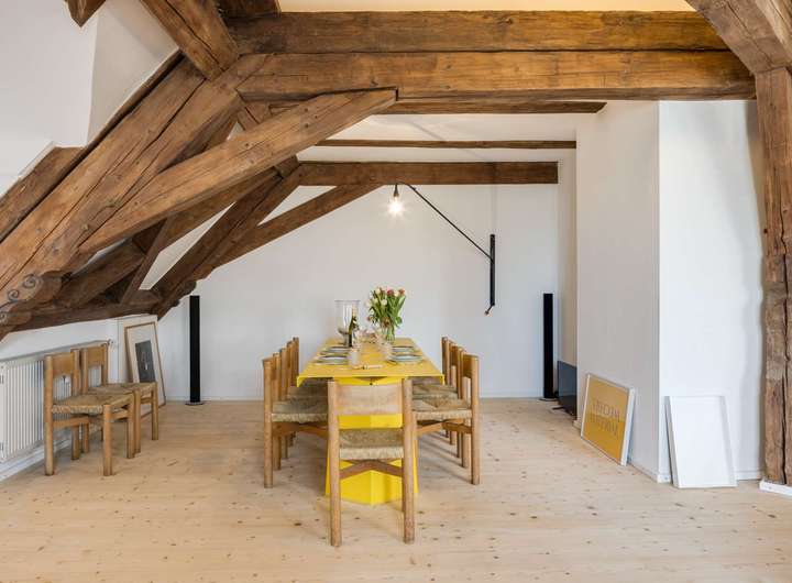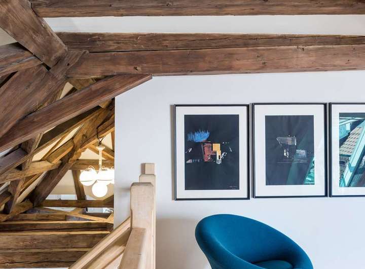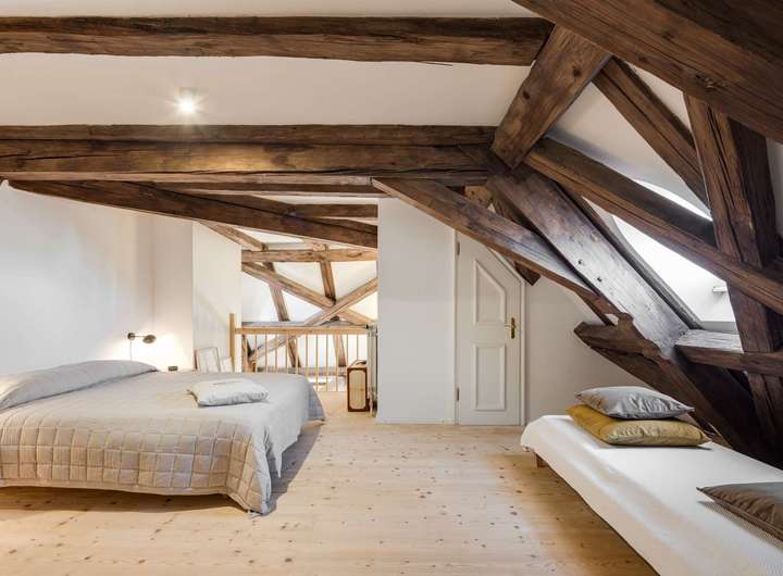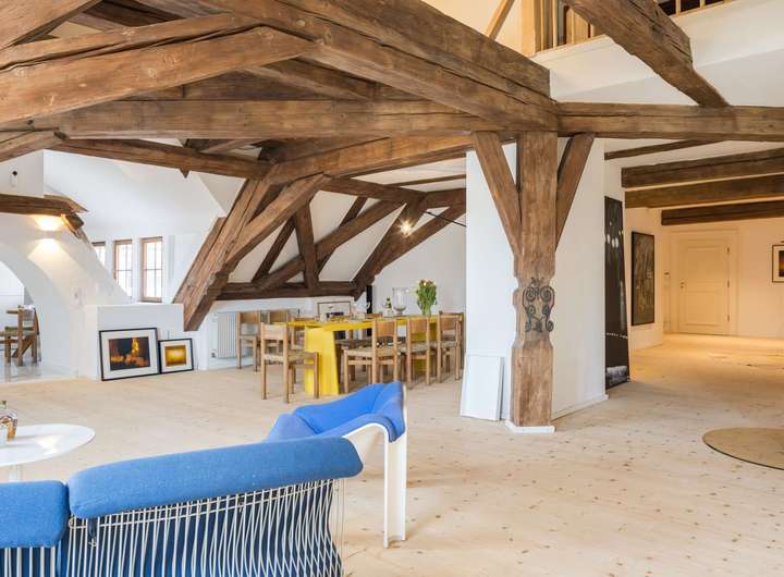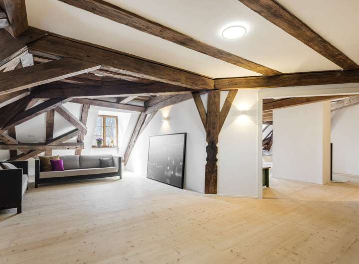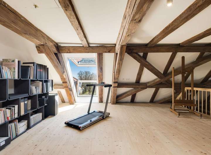 Die im Dachgeschoss gelegene Maisonette-Wohnung besticht durch ihren offenen Grundriss, den beeindruckenden Original-Dachstuhl aus dem Jahr 1726 und ein großzügiges Raumgefühl mit Loft-Charakter. Auf der unteren Ebene befindet sich der helle Wohn- und Essbereich mit offener Küche sowie ein weiteres Zimmer, ideal als Arbeits-, Gäste- oder Kinderzimmer. Auf der Galerieebene erwarten Sie das Schlafzimmer mit Bad en suite sowie ein weiteres Badezimmer.