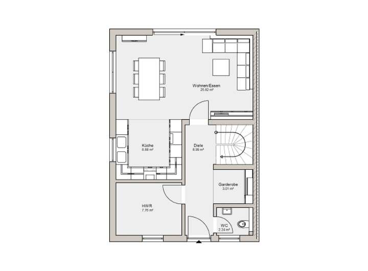 Dabei muss man im Grundriss auf nichts verzichten! Das Erdgeschoss betritt man über einen einladenden Flur mit praktischer Garderobennische. Hauswirtschaftsraum und Gäste-WC sind von dort auf kurzem Wege zu erreichen. Wohn- und Essbereich und Küche bieten einen Blick in den eigenen Garten, große Fensterelemente spenden Licht und lassen den Raum noch großzügiger wirken.