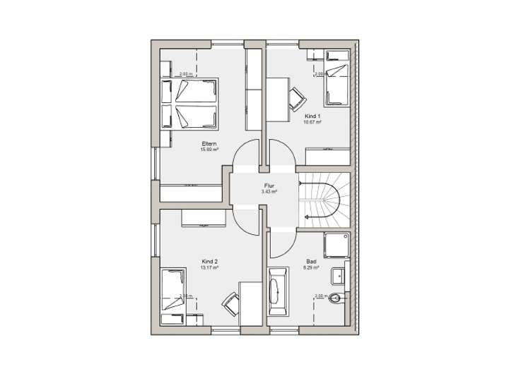 Das Dachgeschoss bietet mit zwei Kinderzimmern Platz für die ganze Familie. Auch hier versorgen die großen Gauben den Wohnraum mit viel Licht und lässt die Wohnräume immer hell und freundlich erscheinen. Das Badezimmer bietet genügend Raum für ein entspannendes Dusch- und Badeerlebnis. Das Dachgeschoss ist mit zwei großen Gauben ausgestattet, die die Wohnfläche erhöhen und die Wohnräume mit Licht versorgen. Das Dachgeschoss kann auf Wunsch um ein praktisches Home-Office erweitert werden.