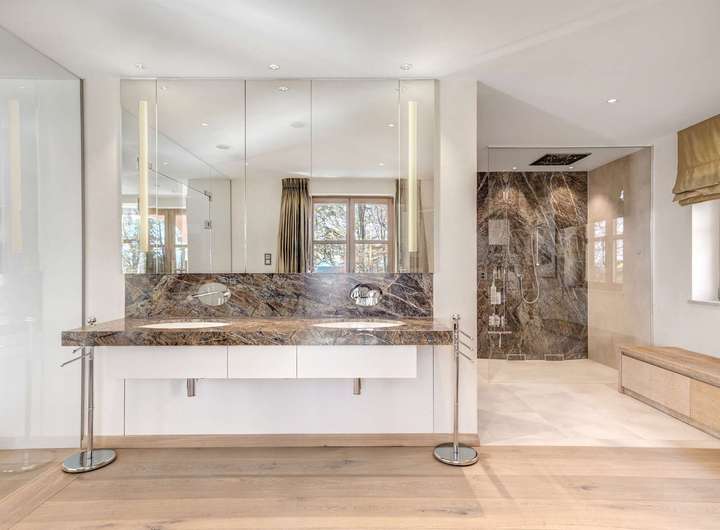 Die Villa besticht durch ihre zeitlos moderne Architektur, klare Linien, großzügige Raumkonzepte und eine vollkommene Symbiose zwischen Innen und Außen. Großflächige Fensterfronten rahmen wie Gemälde den atemberaubenden Blick auf den Starnberger See und das majestätische Alpenpanorama, während das natürliche Licht die hochwertigen Materialien in Szene setzt. Jedes Detail wurde mit höchstem Anspruch an Qualität, Stil und handwerklicher Perfektion umgesetzt – von den fein abgestimmten Oberflächen über die stimmungsvolle Beleuchtung bis hin zu den maßgefertigten Einbauten. Die Architektur vermittelt Leichtigkeit und Großzügigkeit, ohne dabei auf Geborgenheit und Wärme zu verzichten.