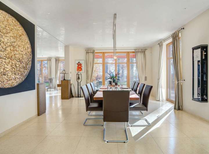 Der repräsentative Wohnbereich mit offenem Kamin bildet das Herzstück des Hauses und bietet Raum für stilvolle Empfänge ebenso wie für familiäre Geborgenheit. Die exklusive Küche mit hochwertigen Geräten erfüllt höchste Ansprüche an Funktion und Design. Der angrenzende Essbereich bietet spektakuläre Ausblicke auf den See – ein Ort für genussvolle Momente mit Familie und Freunden.