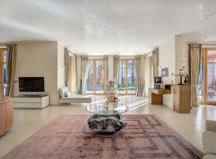 Die lichtdurchfluteten Wohn- und Aufenthaltsräume öffnen sich über fließende Übergänge zu weitläufigen Terrassen und dem gepflegten Garten – ein Rückzugsort der Ruhe und Entspannung.