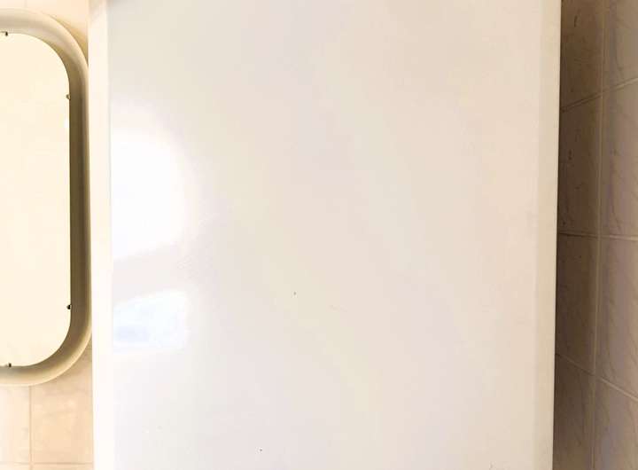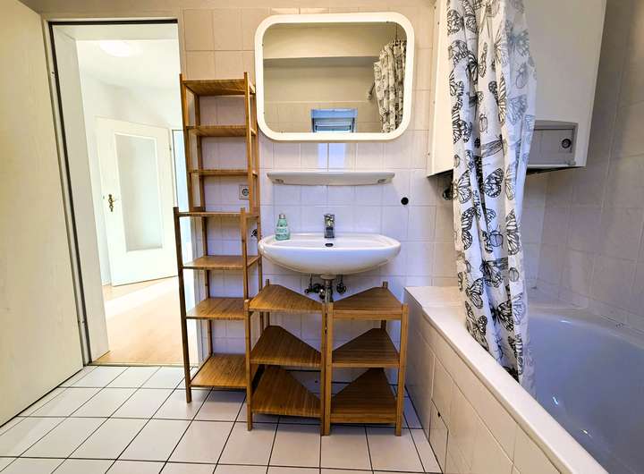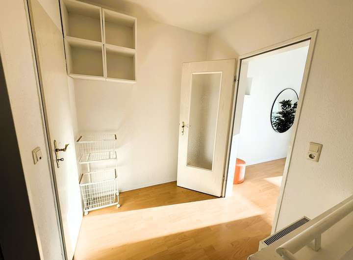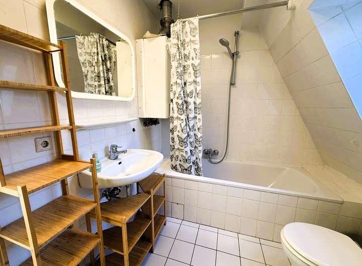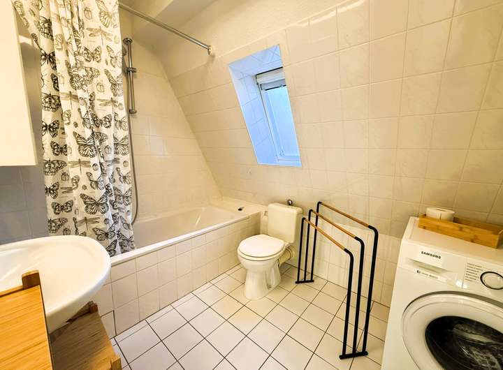 Eine offene Natursteintreppe führt Sie ins Obergeschoss. Links gelangen Sie in das Badezimmer – weiß gefliest mit Badewanne, WC und Waschtisch. Auch ein Waschmaschinenanschluss sowie die Gastherme mit Warmwasseraufbereitung von Buderus haben hier ihren Platz. Durch das Dachflächenfenster gelangt Tageslicht hinein und feuchte Luft hinaus. Der anliegende Schrankraum wird sich als äußerst funktionale Aufbewahrungsmöglichkeit für Ihre Garderobe erweisen.