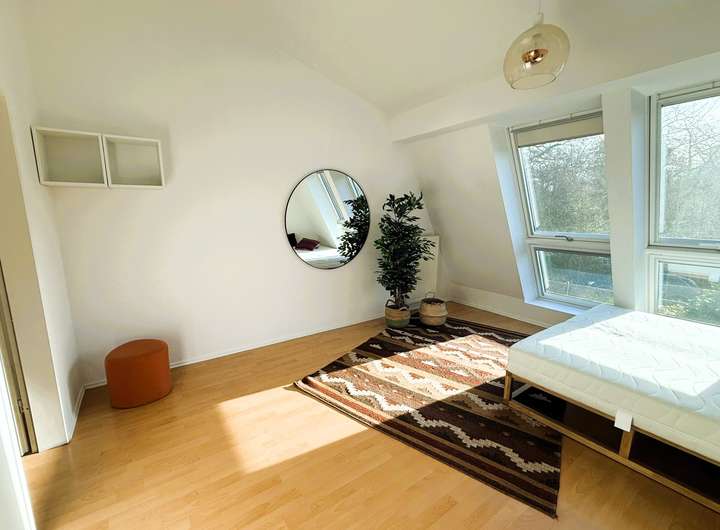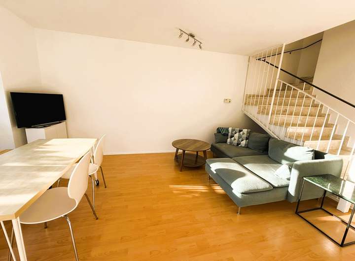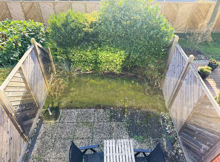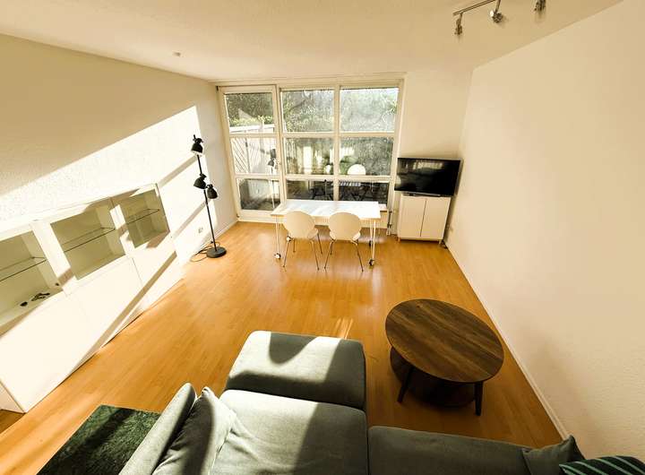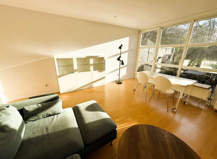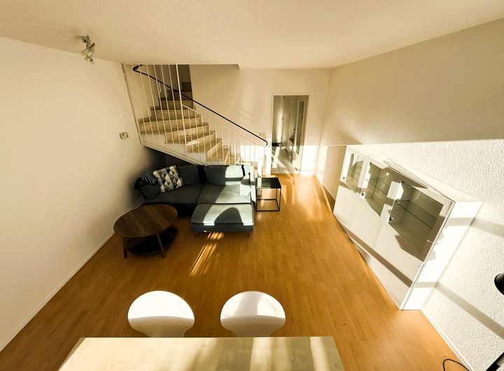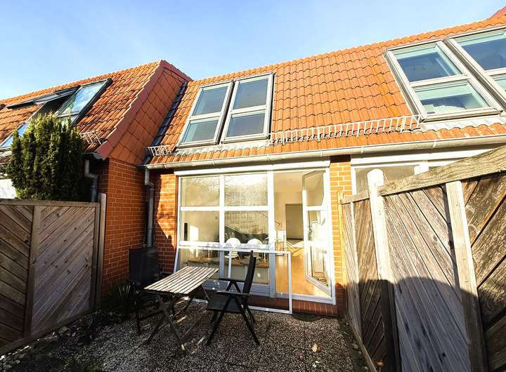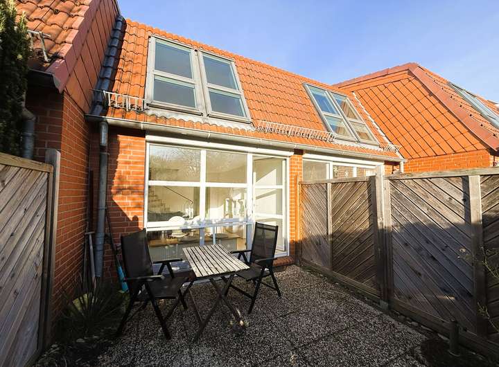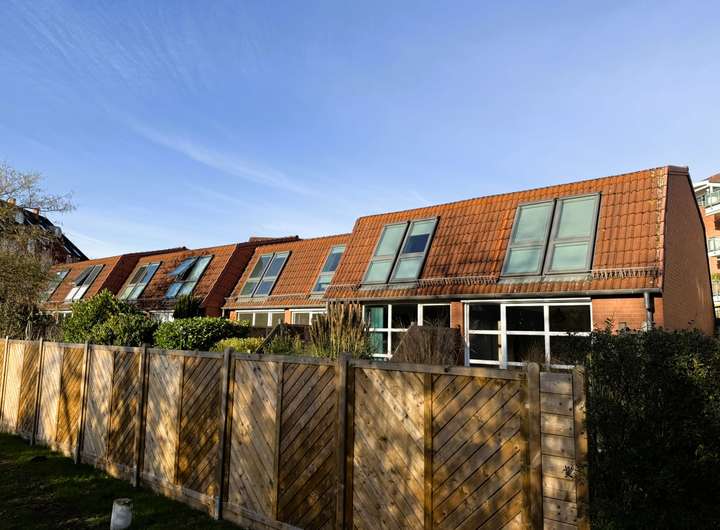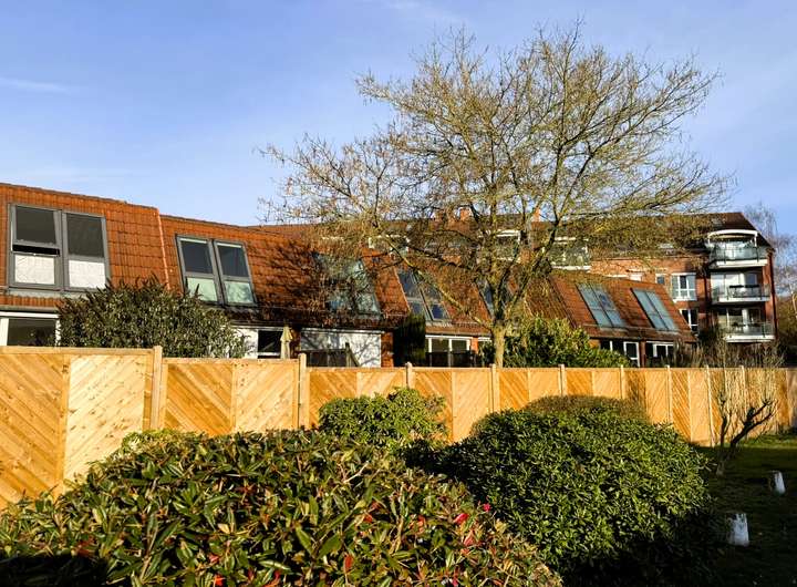 Dem Raum vorgelagert sind die Terrasse sowie der kleine Südgarten, der sich wie bei den benachbarten Reihenhäusern zum Gemeinschaftseigentum hin öffnen lässt. Aktuell sorgen eine Hecke sowie seitliche Sichtschutzelemente für ein hohes Maß an Privatsphäre.