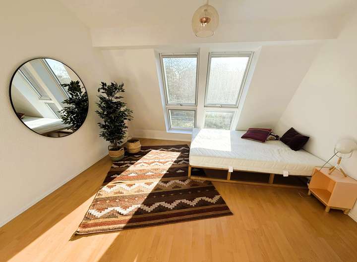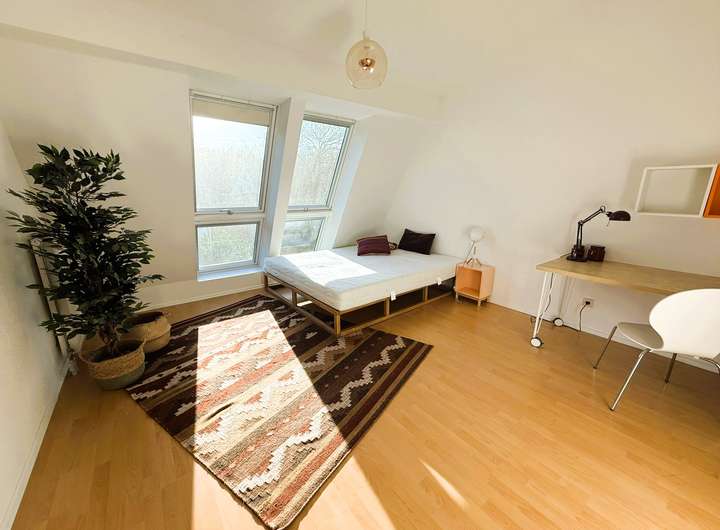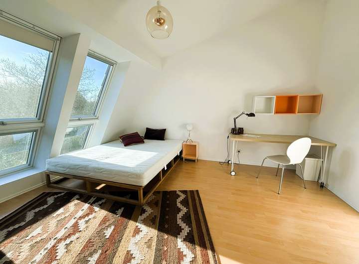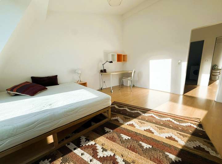 Das großzügige Schlafzimmer mit seinen beiden bodentiefen Fensterelementen ist ebenfalls nach Süden ausgerichtet und steht dem Wohnzimmer in punkto Belichtung nichts nach. Die Fenster verfügen über Verdunklungsrollos, als Bodenbelag fand auch hier Buchenlaminat Verwendung.