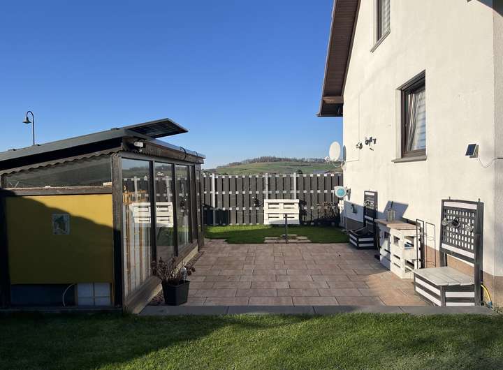 Das Objekt umfasst Erd- und Dachgeschoss, zwei Terrassen, eine Garage sowie ein 964 m² großes, gepflegtes Grundstück. Ein zum Wintergarten umgebautes Gartenhaus erweitert die Nutzfläche sinnvoll. Die PV-Anlage sorgt für zusätzliche energetische Vorteile.
