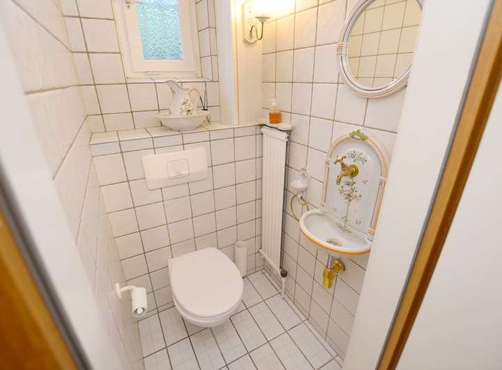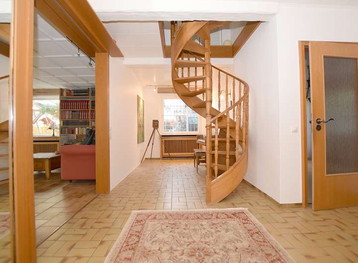Im Erdgeschoss finden Sie eine Diele mit Platz für ein Klavier und Spindeltreppe ins Dachgeschoss, einen geräumigen Wohnbereich mit offenem Kamin, ein separiertes Esszimmer, eine einfache Küche sowie ein großes Schlafzimmer, ein Arbeitszimmer, ein Vollbad sowie ein Gäste-WC. Diese Flächen wurden großzügig angelegt und erinnern noch ein bisschen an den „Glanz der alten Zeit".