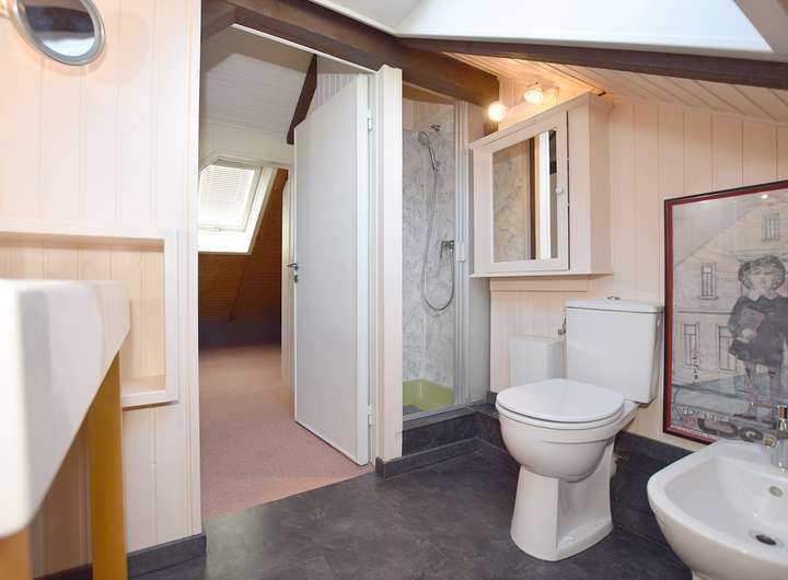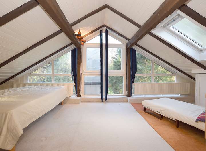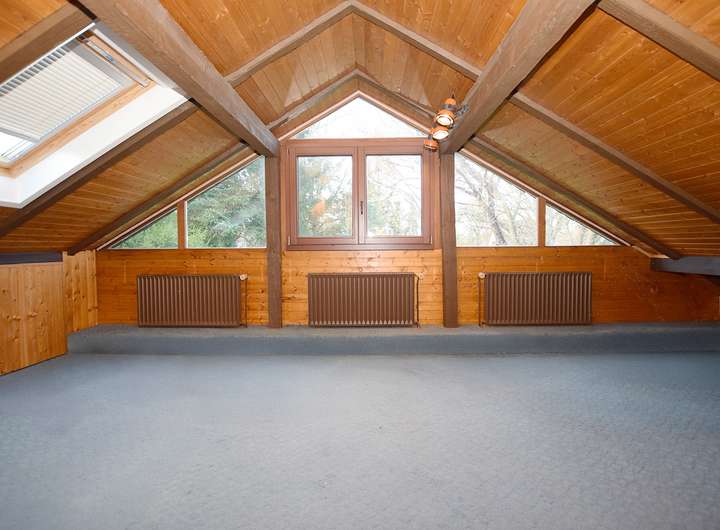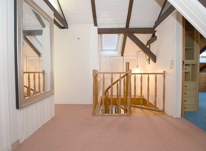 Im Dachgeschoss dominieren gemütliche Hölzer. Hier gibt es zwei große Zimmer mit ausgeprägten Dachschrägen, ein kleines Duschbad sowie einen begehbaren Schrankraum. Große Fenster bieten herrlichen Gartenblick. Das Haus ist renovierungsbedürftig. In welchem Umfang, darüber entscheidet Ihr persönlicher Anspruch und Geschmack.