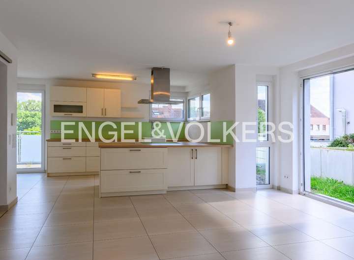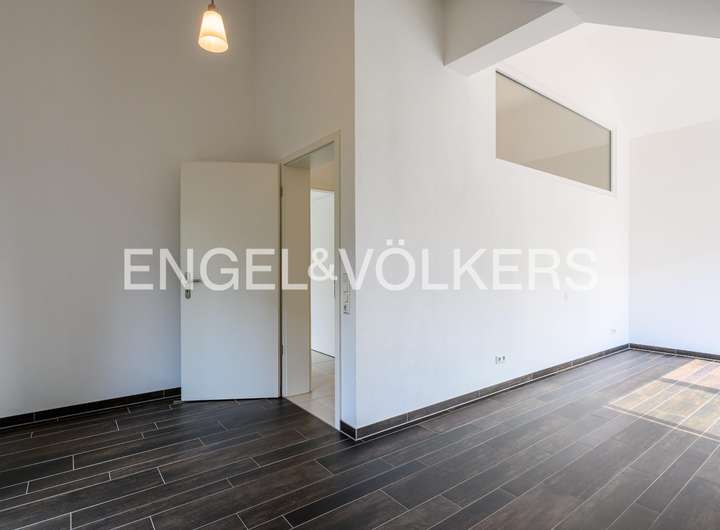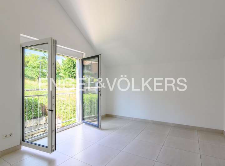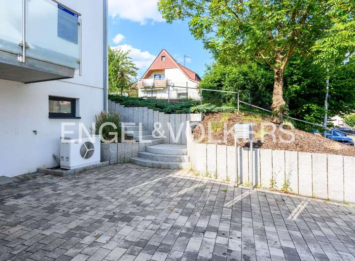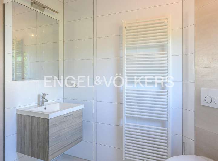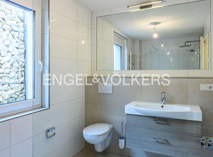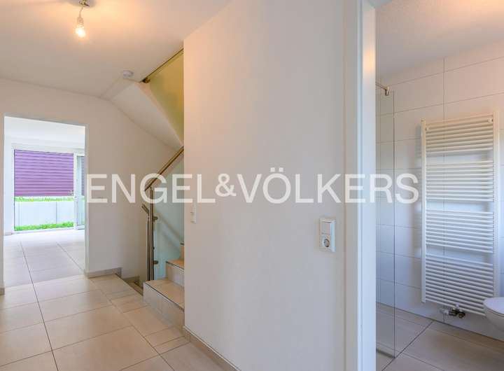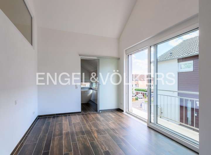 Vom einladenden Eingangsbereich mit großzügiger Garderobe sowie einem separaten Gäste-WC mit Dusche gelangt man über einen kurzen Flur in den weitläufigen Wohn- und Essbereich mit offener Einbauküche. Die moderne Küche, in neuwertigem Zustand, bildet mit hochwertigem Ceranfeld und sämtlichen Einbaugeräten das Herzstück dieses Bereichs – ein Ort, der sowohl zum Kochen als auch zum geselligen Beisammensein einlädt. Für die Einbauküche wird eine monatliche Miete in Höhe von 100 Euro erhoben. Daran anschließend öffnet sich der helle Wohnbereich mit direktem Zugang zum Garten über zwei Ebenen sowie einer Sonnenterrasse, die selbstverständlich mit einer elektrischen Markise ausgestattet ist. Eine weitere, besonders großzügige Terrasse in Südausrichtung rundet das Ensemble auf dieser Ebene ab. Über das elegante Treppenhaus gelangt man in das Obergeschoss. Hier erwarten Sie zwei klug geschnittene Kinder- oder Arbeitszimmer, die durch ein gemeinsames, von beiden Räumen zugängliches Bad verbunden sind. Das großzügige Elternschlafzimmer mit angrenzendem luxuriösem Bad en suite lässt keine Wünsche offen: eine freistehende Badewanne, zwei Waschbecken und eine überdimensionale Dusche schaffen eine private Wellnessoase. Hohe Decken und lichtdurchflutete Räume verleihen dieser Ebene eine besondere Großzügigkeit. Alle Zimmer, einschließlich der Dachflächenfenster, sind mit elektrischen Rollläden ausgestattet. Eine Fußbodenheizung auf sämtlichen Ebenen, betrieben durch eine moderne Luft-Wasser-Wärmepumpe, sorgt für höchsten Wohnkomfort und entspricht zugleich den neuesten energetischen Standards.