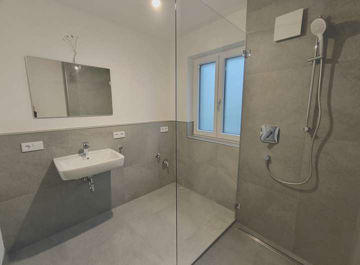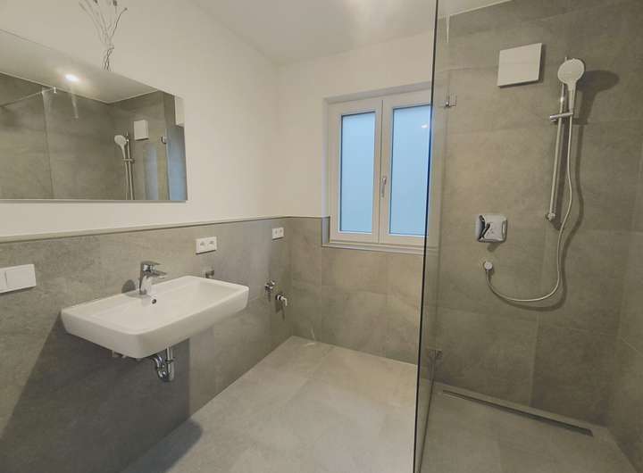 •Modernes Tageslichtbadezimmer mit Dusche und Waschmaschinenanschluss