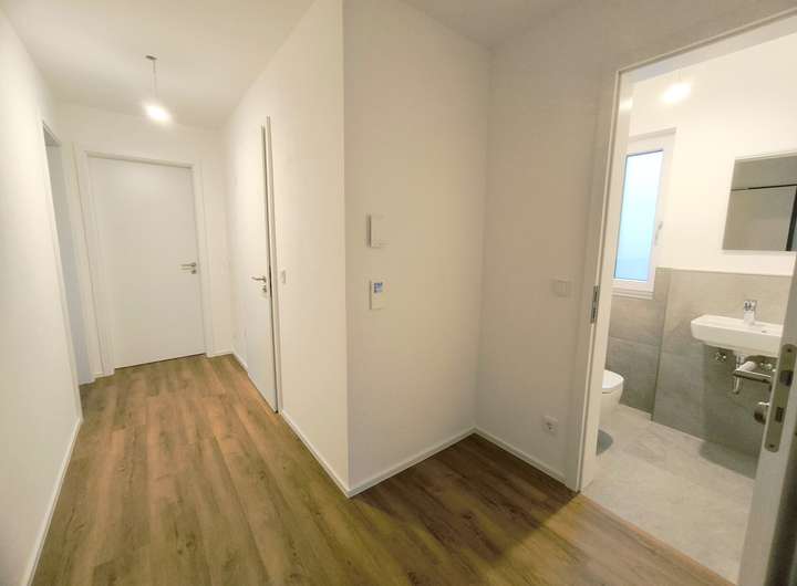 •Hochwertiger Eichenparkett im Wohnzimmer, pflegeleichter Vinylboden in den Schlafräumen und im Eingangsbereich in Holzoptik