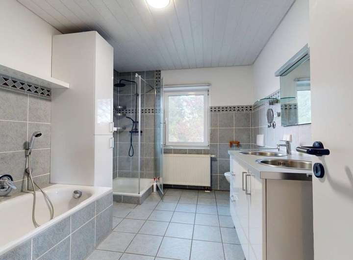 Im Obergeschoss erwarten Sie drei Schlafzimmer, darunter ein großes Hauptschlafzimmer mit Ankleidebereich, der durch Leichtbauwände abgetrennt ist. Das geräumige Badezimmer und ein kleiner Heizungsraum ergänzen das Angebot auf dieser Etage.