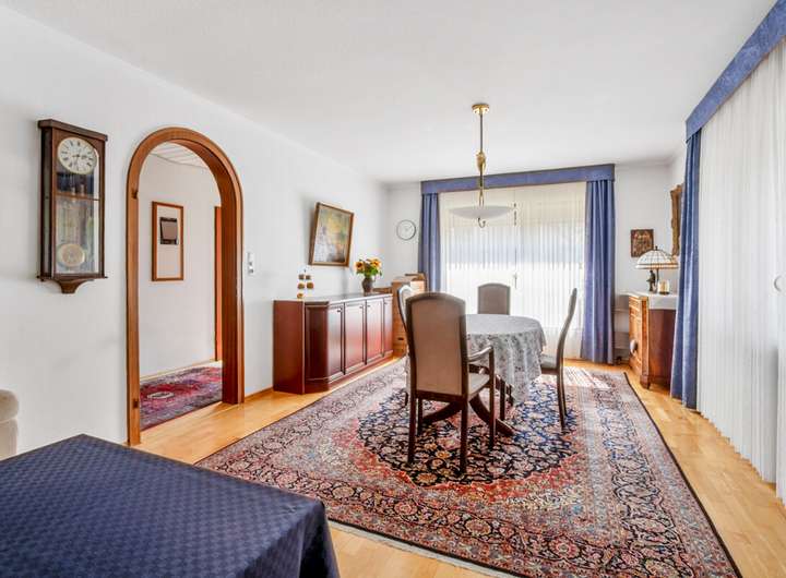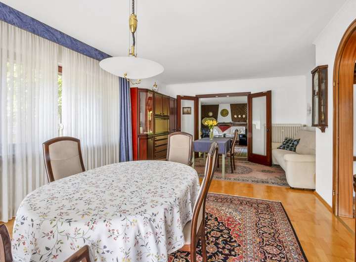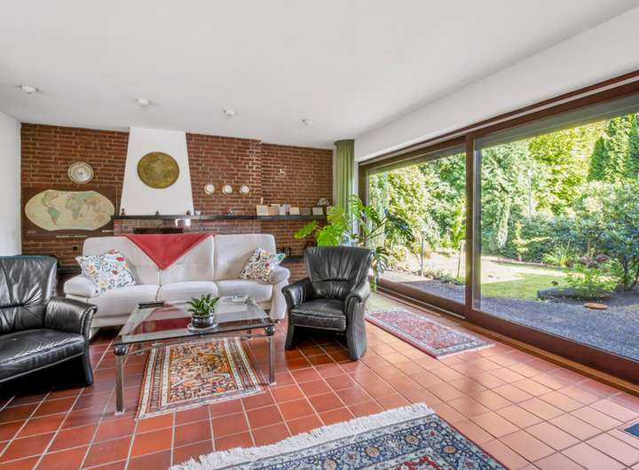 Im Erdgeschoss empfängt Sie ein großzügiger Eingangsbereich. Von hier aus gelangen Sie in das Esszimmer und das angrenzende, teilunterkellerte Wohn- und Kaminzimmer, welches 1976 erweitert wurde. Eine große Fensterfront sorgt für viel Licht und einen schönen Blick in den Garten. Zusätzlich stehen im Erdgeschoss eine Küche, ein Badezimmer mit Wanne, ein Arbeitszimmer sowie ein Schlafzimmer zur Verfügung. Der teilunterkellerte Bereich bietet Platz für Waschmaschine, Heizungsraum und Abstellmöglichkeiten.