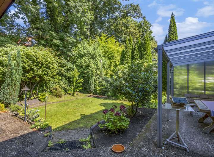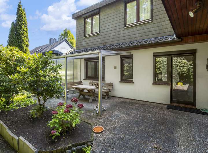 Der Außenbereich überzeugt mit einer pflegeleichten Gartenfläche, zwei überdachten Terrassen sowie einer Garage. So bleibt neben dem Alltag auch Raum für entspannte Stunden im Freien.