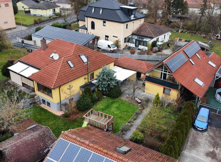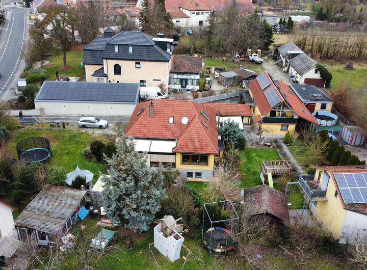 - ca. 160 qm Wohnfläche Hauptwohnung: EG mit offenem Wohn-/Essbereich, Schlafzimmer, Kinderzimmer, Arbeitszimmer, Badezimmer und Wintergarten; DG mit zwei Schlafzimmern und Badezimmer