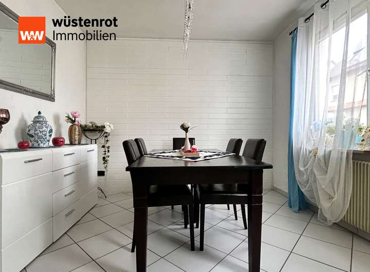 Nebenan ist das helle Esszimmer. Zwei große Fenster und das aufgesetzte, moderne Sicht-Mauerwerk sorgen für eine angenehme Atmosphäre. Die Küche ist praktisch gestaltet. Dank der durchdachten Anordnung der Küchenzeile sind hier Funktionalität und Stil vereint. Drei Fenster sorgen beim Brutzeln für schönes Licht. Und wenn es am Herd einmal heiß hergeht, können Sie Dank der Fenster prima lüften. Das Gäste-WC mit Fenster sorgt für zusätzlichen Komfort für Ihre Gäste.