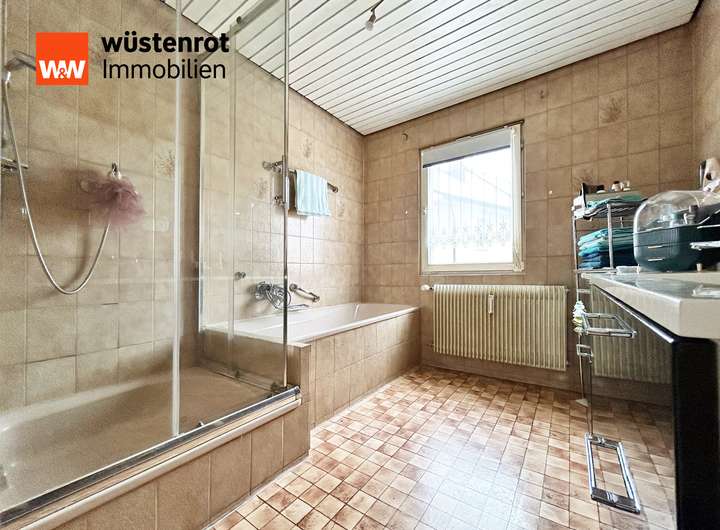 Das Badezimmer überzeugt mit seiner charmanten Größe. Hier ist genug Platz für die Duschkabine, eine Badewanne, zwei Waschtische und das große Fenster, das viel Tageslicht hineinlässt. Dank der Größe des 80er Jahre-Baustils haben Sie eine wunderbare Grundlage, um mit wenig Aufwand ein modernes Wellnessbad zu schaffen.