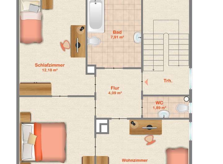 Über die charmante Treppe gelangen Sie in das obere Geschoss. Hier erwartet Sie der Bereich zur Entspannung und Ruhe. Im schönen Wohnzimmer ist ideal für gemütliche Stunden. Genießen Sie nach einem langen Tag Ihren Feierabend. Machen Sie es sich dazu auf der Couchlandschaft bequem. Zwei gemütliche Schlafzimmer bieten Platz für herrliche Träume und gute Erholung. Eines der Schlafzimmer beeindruckt mit einem charmanten Erker und drei Fenstern - Dank der Rollläden können diese ideal verdunkelt werden.