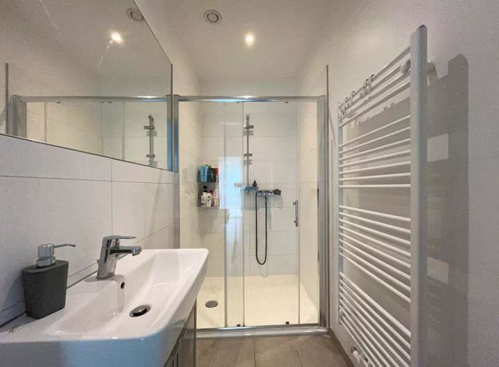 Das Dusch-Badezimmer zeigt sich modern und praktisch: Eine großzügige, rahmenlose Duschkabine, helle Fliesen und ein funktionaler Waschtisch schaffen einen Rahmen für entspannte Routinen.