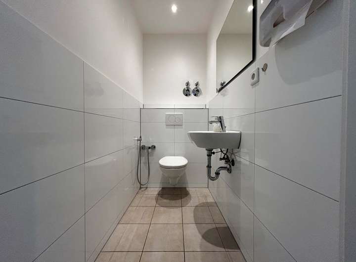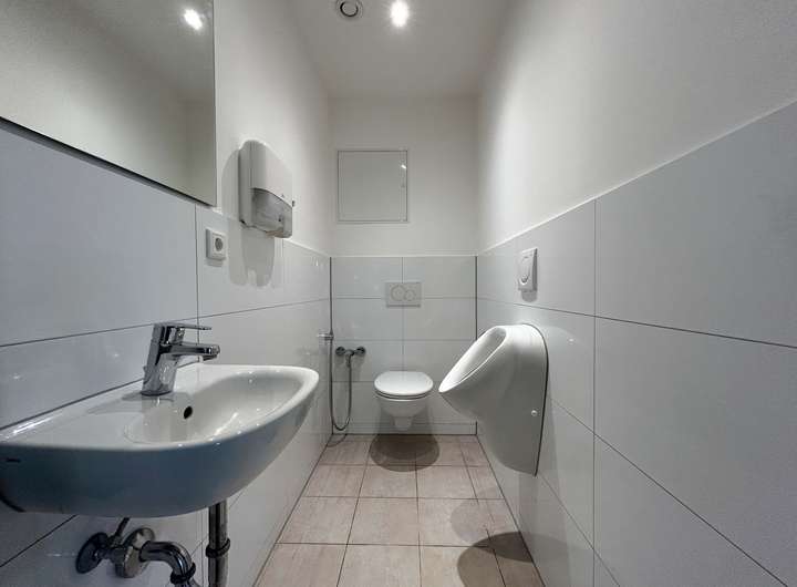 Hinzu kommt eine separate Damen- und Herren-Toilette. Diese sind schlicht und funktional, ein kleines Extra für den Alltag. Dieses Ensemble der Sanitärräume kommt aus der ursprünglichen Nutzung als Gewerbeeinheit. Mit überschaubarem Aufwand können die separaten Sanitärräume zu einer großen Wohlfühloase verbunden werden. Überzeugen Sie sich davon bei der Besichtigung.