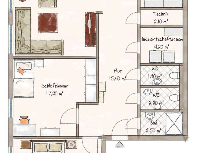+ 3 moderne Zimmer: Wohn-/Essbereich, Schlafzimmer 1, Schlafzimmer 2; Küche, Bad, zwei WC-Räume, Hauswirtschaftsraum, Technikraum, Abstellraum und Flur