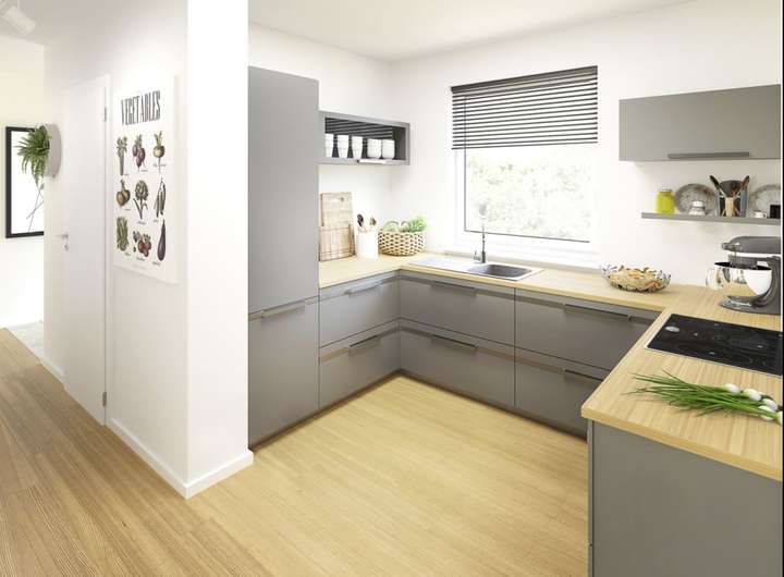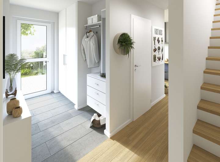 Das Erdgeschoss mit seinem lichtdurchfluteten Wohn- und Esszimmer mit offener Küche, Diele und Gäste-WC lässt keine Wünsche offen.