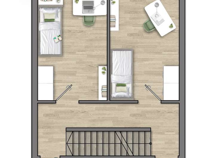 In der ersten Etage befinden sich drei Zimmer, die als Schlafzimmer, Spielzimmer oder als Homeoffice genutzt werden können.