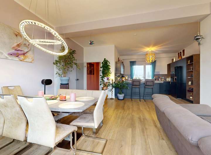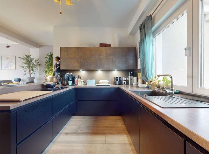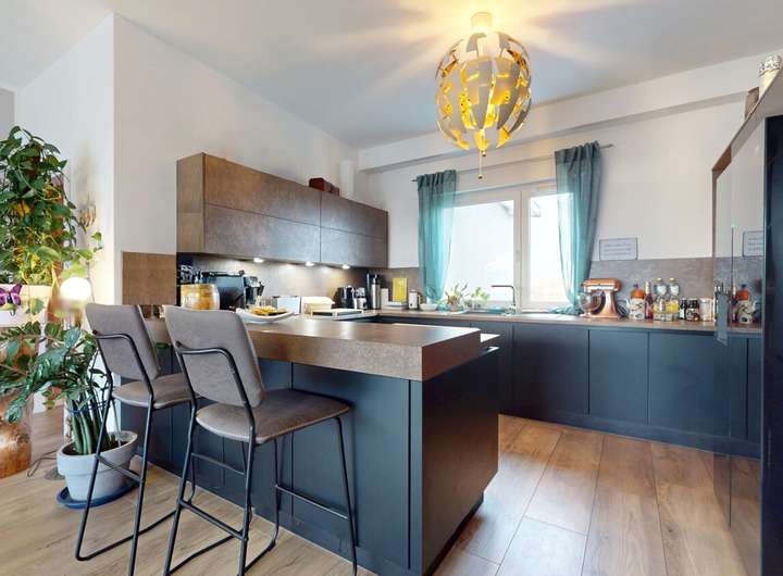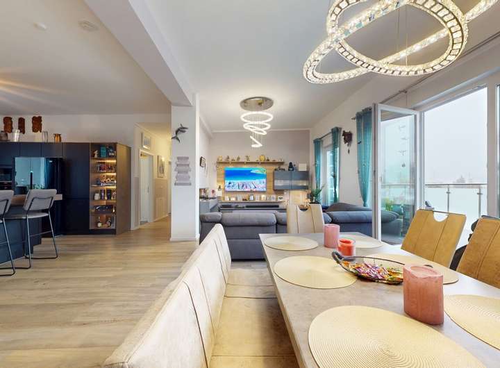 Die Wohnung überzeugt mit einer hochwertigen Einbauküche inklusive Siemens-Geräten, integriertem Dunstabzugssystem und Beko-Kühlschrank – ein Ort, an dem Kochen zum Genuss wird.