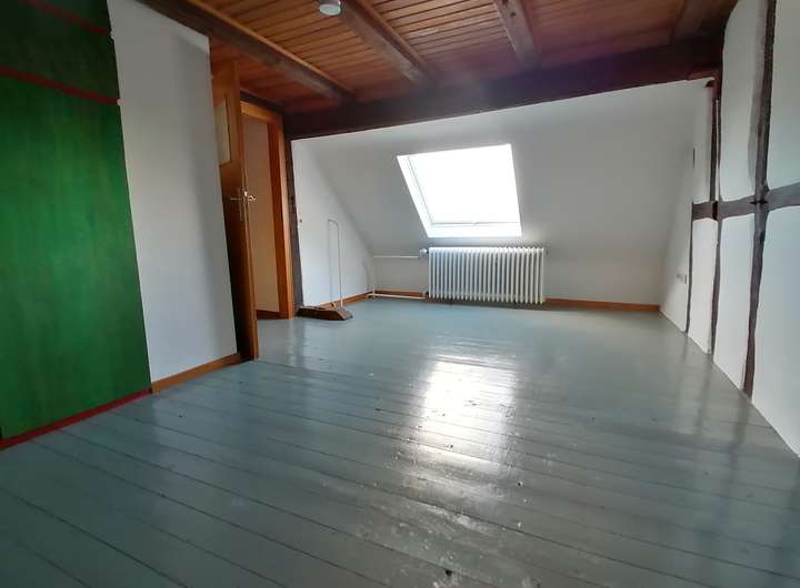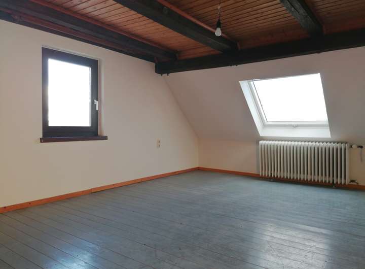 Im Dachgeschoss liegen zwei große Zimmer mit Dachfenstern, ein Bad mit Toilette / Waschbecken und ein kleiner Flur.