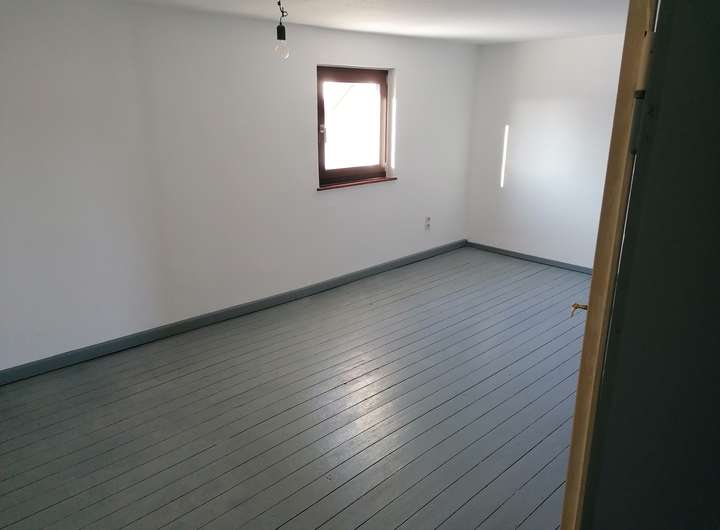 Im Dachgeschoss gibt es Holzböden grau angestrichen.