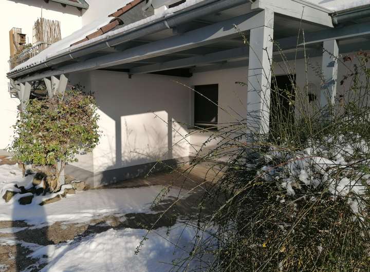 Vor dem Hauseingang liegt eine große überdachte Terrasse, auf der man bei fast jedem Wetter draussen sitzen kann.