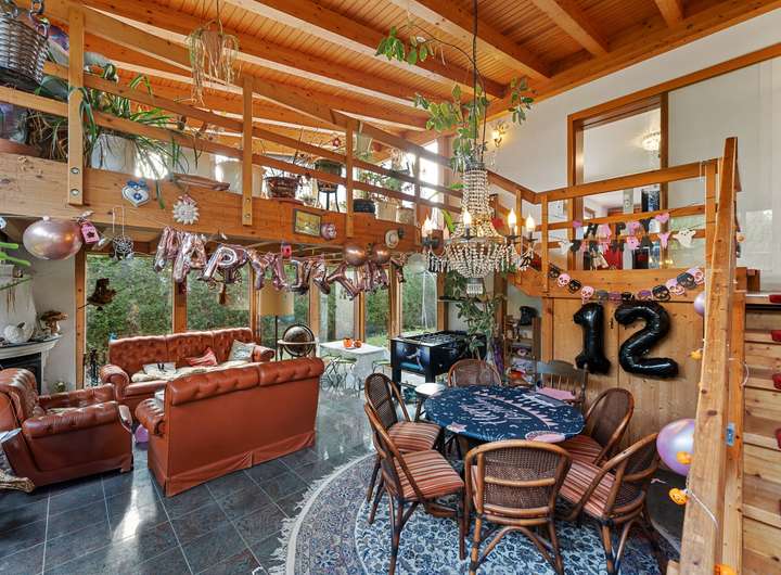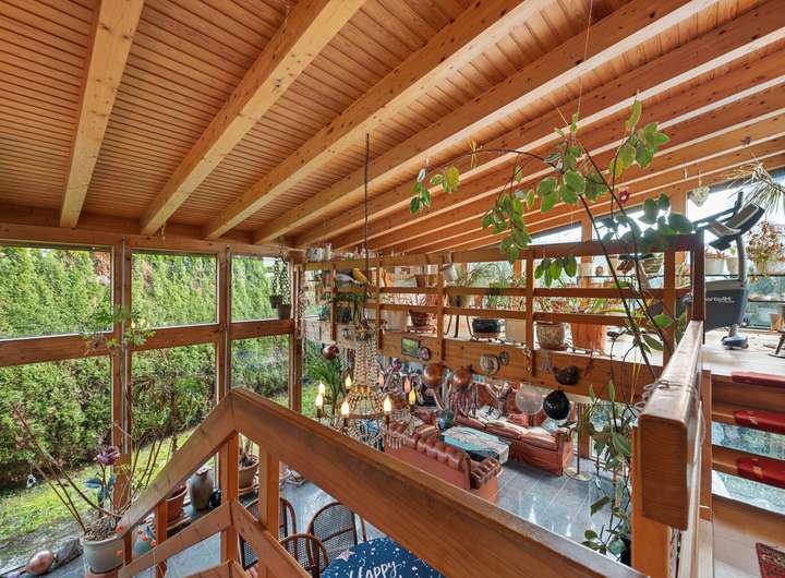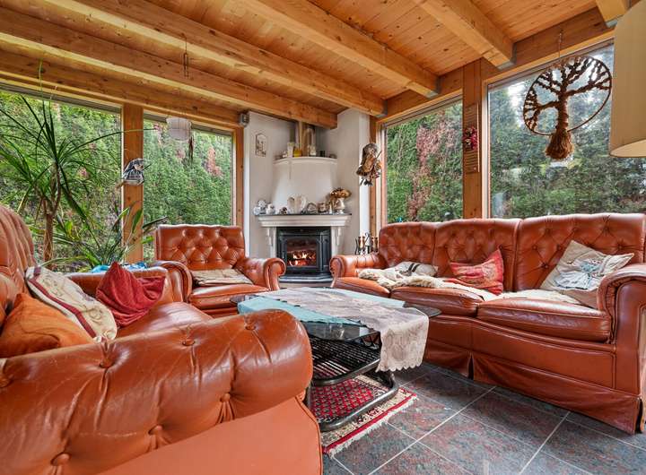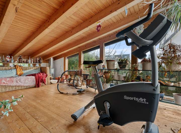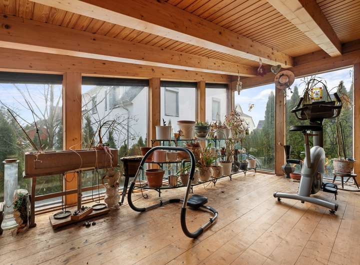 In den 1990er-Jahren realisierte die Firma Syndikat einen großzügigen und hochwertigen Anbau über zwei Etagen mit Wintergartencharakter, der das Wohnhaus erheblich erweitert. Dadurch verfügt die Hauptwohnung über zwei miteinander verbundene Wohnbereiche. Die sehr geräumigen Wohnzimmer im Erd- und Gartengeschoss sind über eine Holzgalerietreppe verbunden und jeweils mit einem formschönen Kamin ausgestattet.