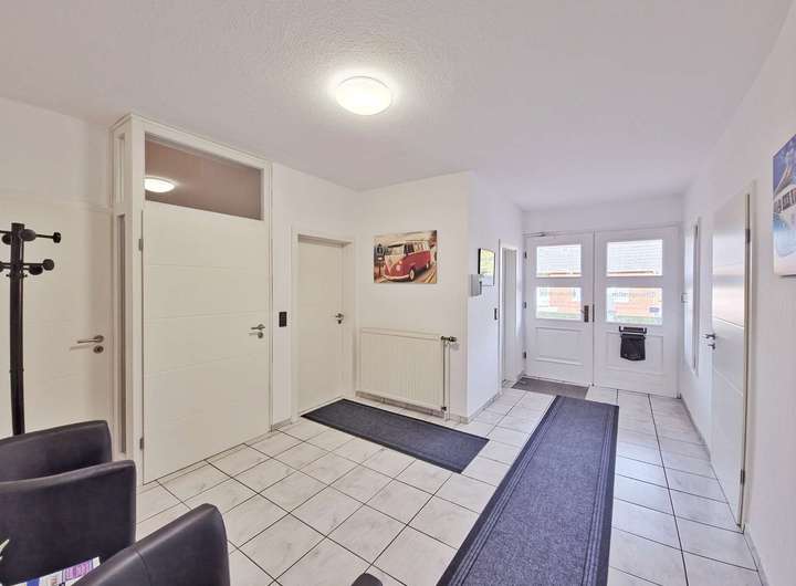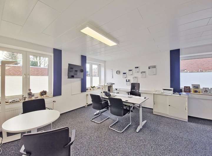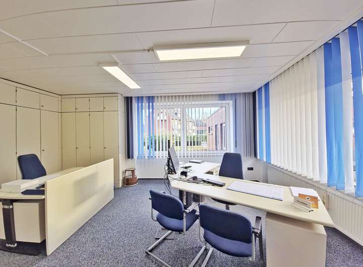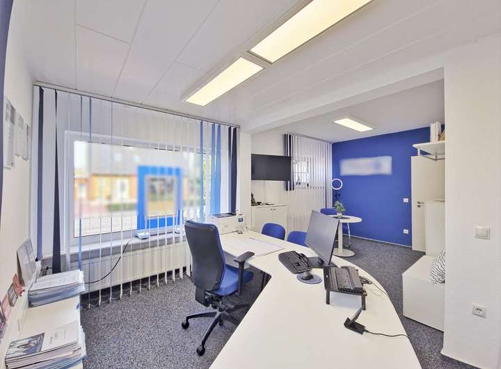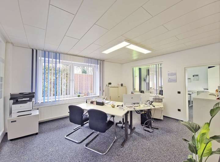 Das Erdgeschoss umfasst ein Gäste-WC, eine Küche mit angrenzender Speisekammer, einen zentralen Flur mit Zugang ins Obergeschoss sowie vier separat nutzbare Büros.
